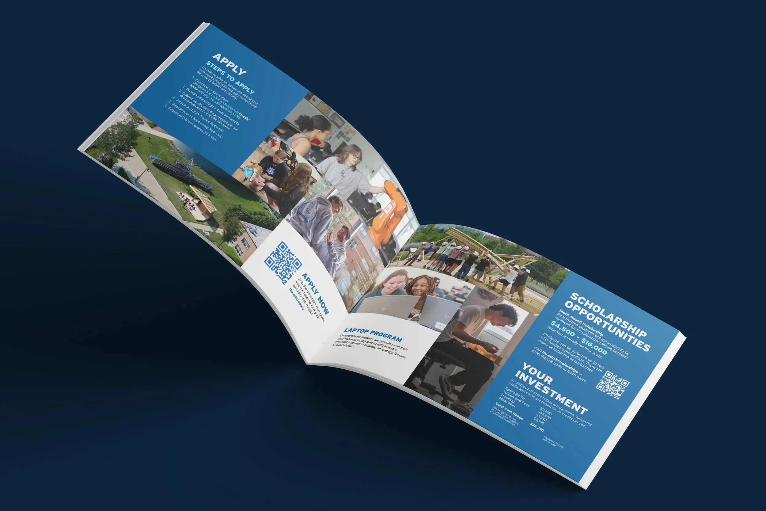 This spread offers everything prospective students need to move forward. It includes clear application guidance, an overview of LTU’s laptop program, and details on scholarship opportunities. The left page guides readers through the simple application process and features student-focused images that showcase LTU’s hands-on, collaborative environment. The right page highlights affordability by outlining merit-based scholarships and total cost information in a straightforward layout. Together, the spread combines practical information with genuine student visuals. This helps applicants feel informed, supported, and ready to apply.