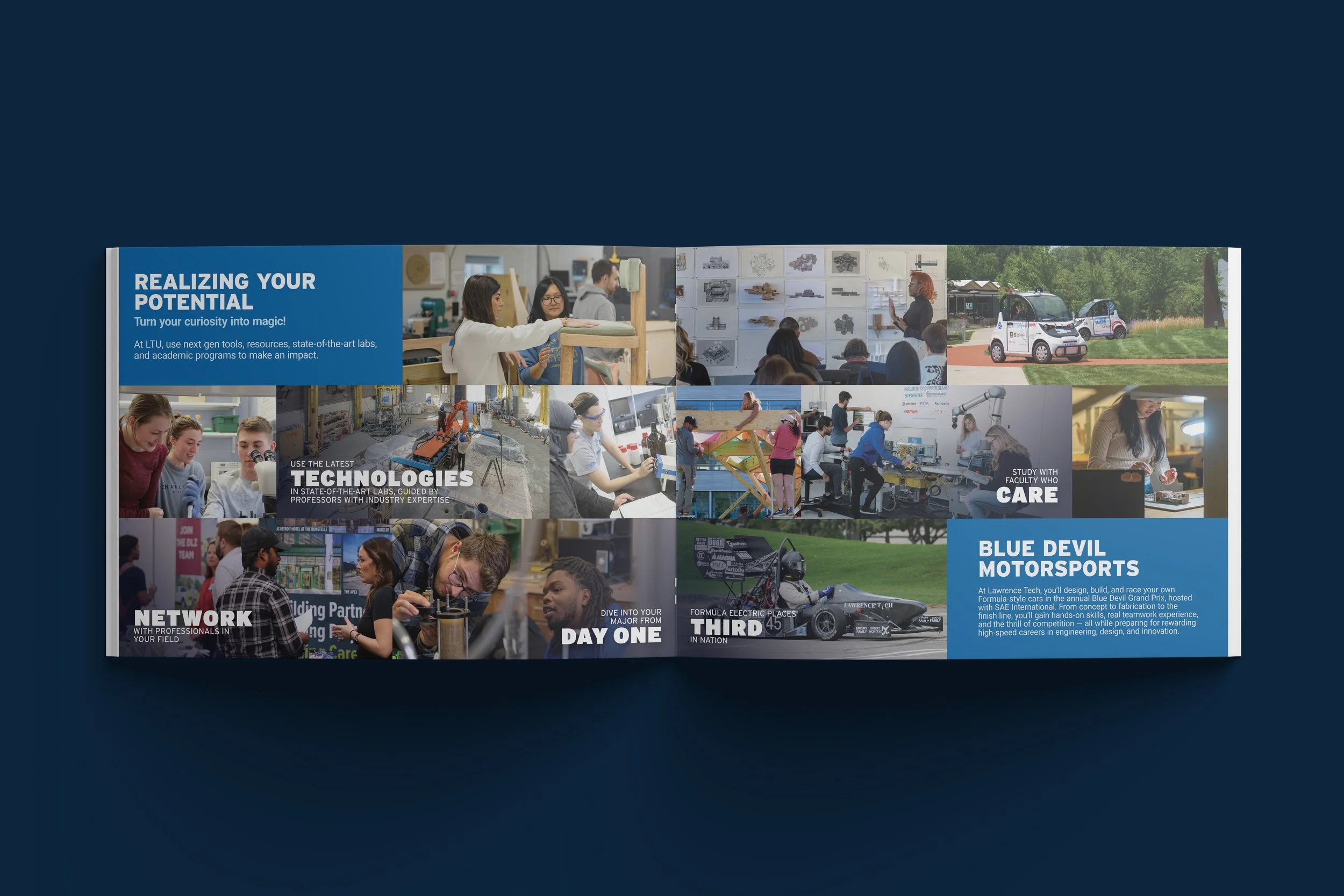 This spread highlights LTU’s practical, future-oriented academic experience. It shows real students using modern tools, working together in studio and lab settings, and engaging directly with industry-level projects. From new technologies to supportive faculty mentorship, the layout emphasizes how LTU turns curiosity into ability. The Blue Devil Motorsports section features one of the university’s most well-known, high-performance student teams. It reinforces LTU’s culture of innovation, teamwork, and real-world success.