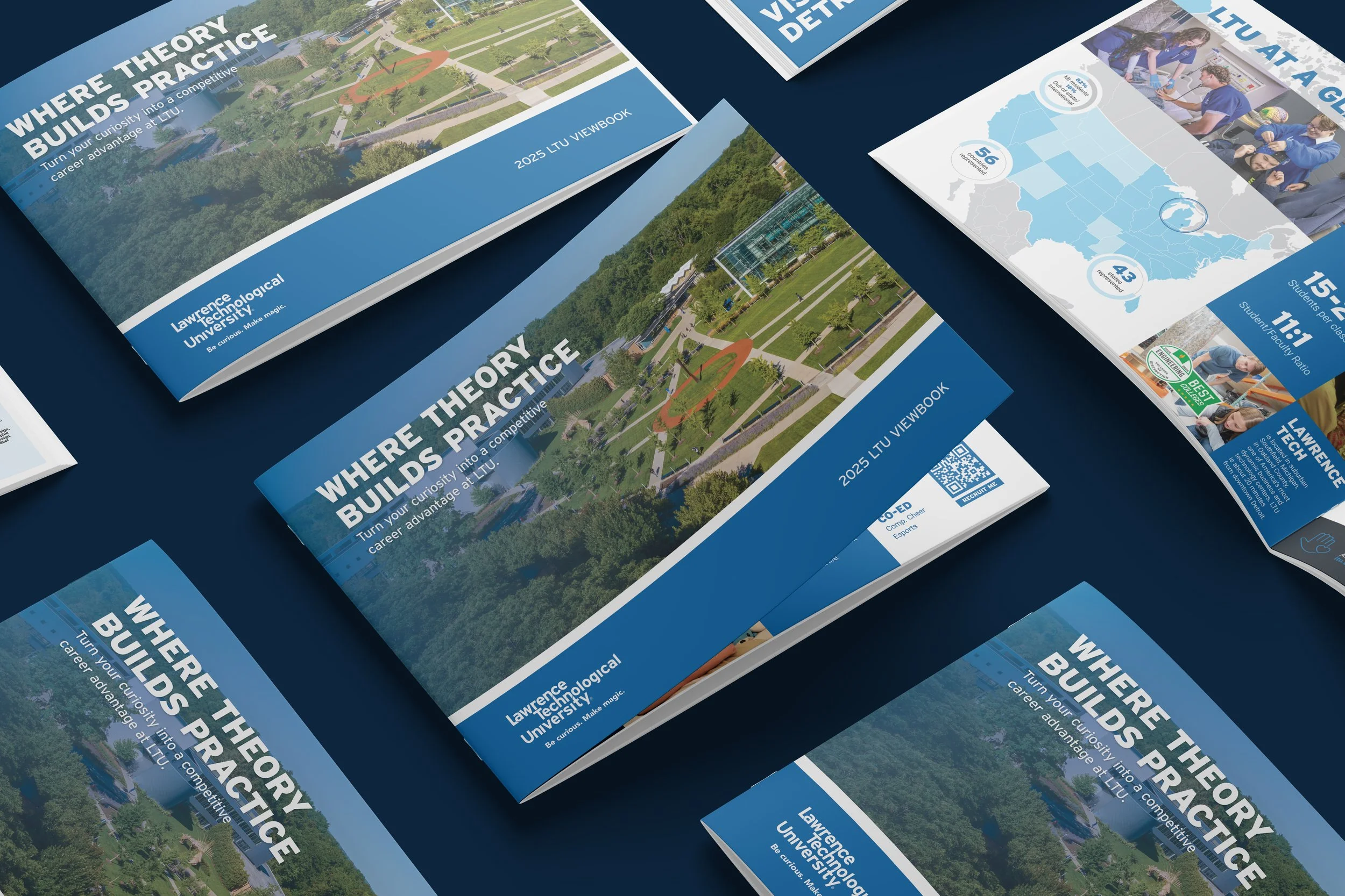 The 2025 LTU Viewbook builds on the admissions teaser by offering prospective students a clearer, more engaging view of campus life, academics, and hands-on opportunities at Lawrence Tech. This publication is clean, modern, and visually appealing. It features striking photography, organized layouts, and LTU’s signature blue branding to navigate readers through all parts of the university experience. From academic programs and research to community, location, and career outcomes, this piece highlights LTU as a place where students can grow, explore, and start their futures.