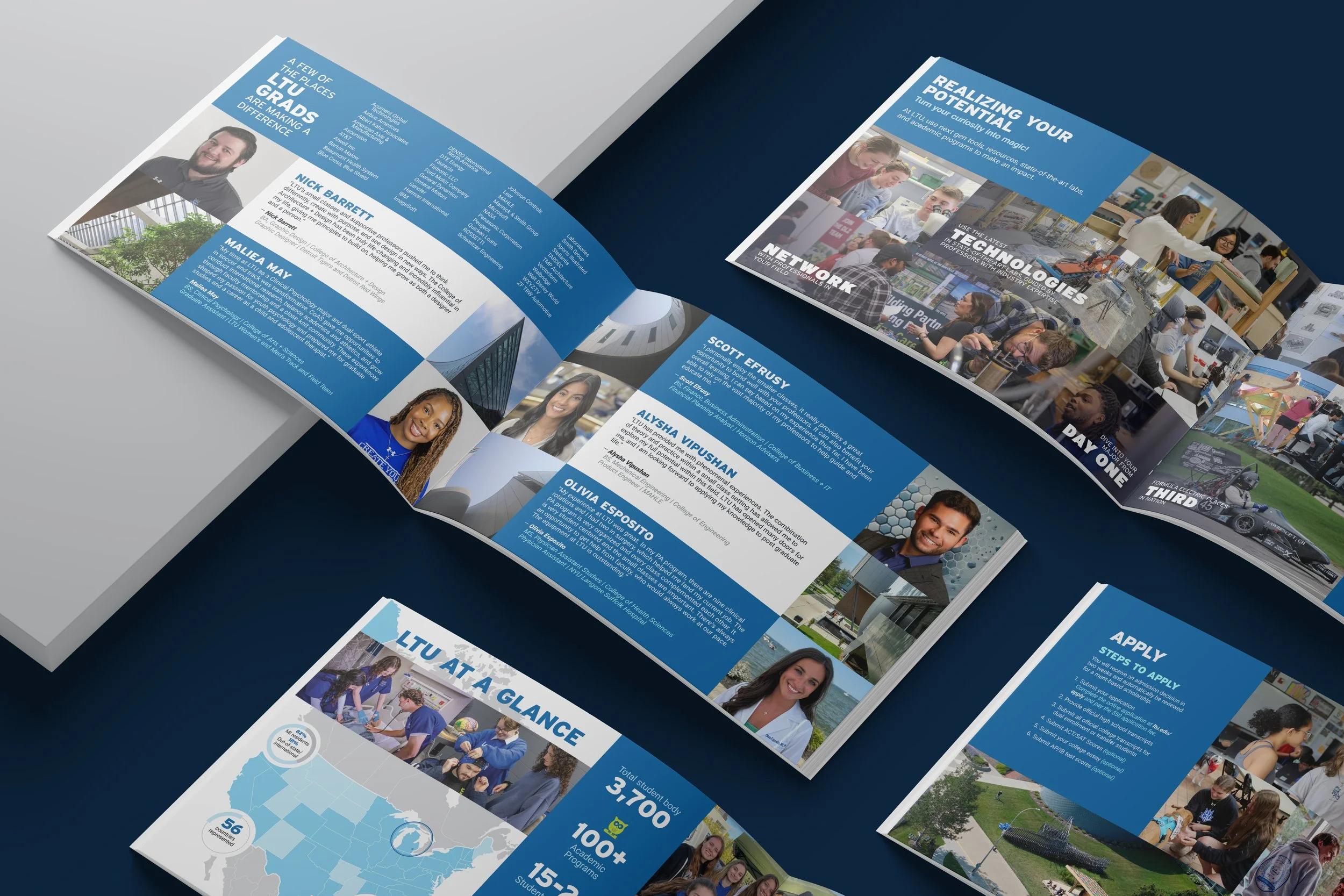 This spread showcases real LTU graduates and the impact they are making after graduation. Each profile features a different success story, ranging from engineering to architecture to design. It highlights the diverse career paths students follow with the help of LTU’s hands-on learning and industry connections. Accompanied by lively campus images, the layout emphasizes how LTU prepares students to enter their fields with confidence and make a difference from day one.