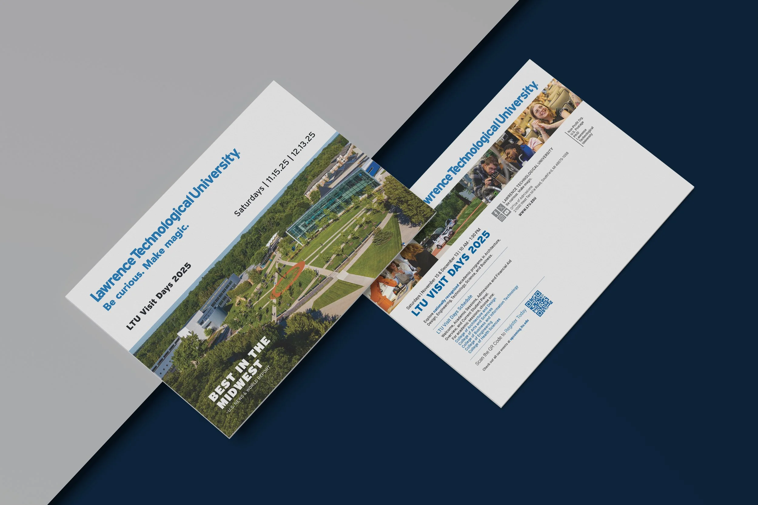 A promotional postcard showcases LTU’s 2025 Visit Days. It features eye-catching visuals and a clean layout that offers prospective students a clear view of campus life, academics, and event details.